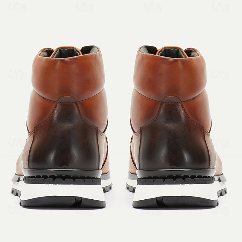 Highlights [Fabric] Crafted from luxurious Italian full-grain cowhide leather, these men’s boots offer both durability and sophistication. The rich, warm brown upper not only exudes elegance but is also built to withstand the rigors of various environments. [Fit] Featuring a retro lace-up design, these ankle boots ensure a secure and customizable fit, with a padded collar that enhances comfort for all-day wear. The round toe shape adds to the overall comfort and timeless style. [Design Highlights] The boots stand out with their contemporary silhouette and reinforced stitching, which adds both strength and style. The robust, non-slip rubber sole with distinct tread patterns ensures stability and traction on different surfaces, making them a reliable choice for diverse settings. [Occasions] Ideal for both casual and semi-formal occasions, these boots seamlessly complement jeans or chinos, making them a versatile addition to any wardrobe. Whether for a day out in the city or a relaxed evening gathering, they blend traditional craftsmanship with contemporary aesthetics. [Size Range] Available in a wide range of sizes from US6 to US13, accommodating various foot sizes. These boots offer a perfect fit for men seeking style and comfort in their footwear.