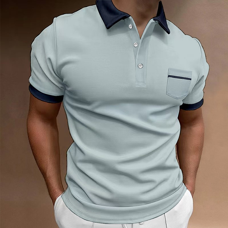 : Featuring a classic lapel neckline, this polo shirt incorporates a color block pattern, offering a modern twist on a staple wardrobe piece. The short sleeves are accentuated with a contrasting white cuff, adding a subtle touch of sophistication. The three-button placket allows for adjustable comfort, while the front chest pocket with a white stripe detail enhances its contemporary design.