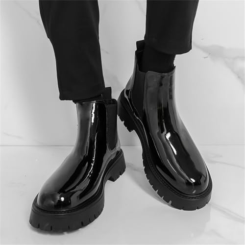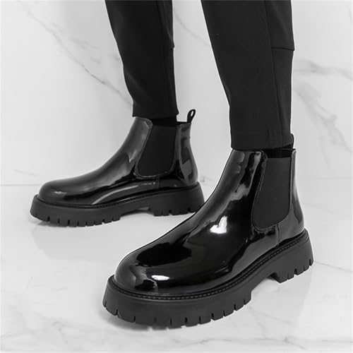 Men's Patent Leather Pull On Platform Low Chunky Block Heel Chelsea Boots Round Toe Lug Sole Ankle Short Boots Comfort Fashion Dress Shoes for Prom Party Dating Wedding 6