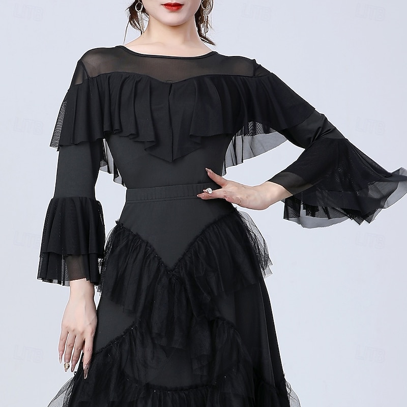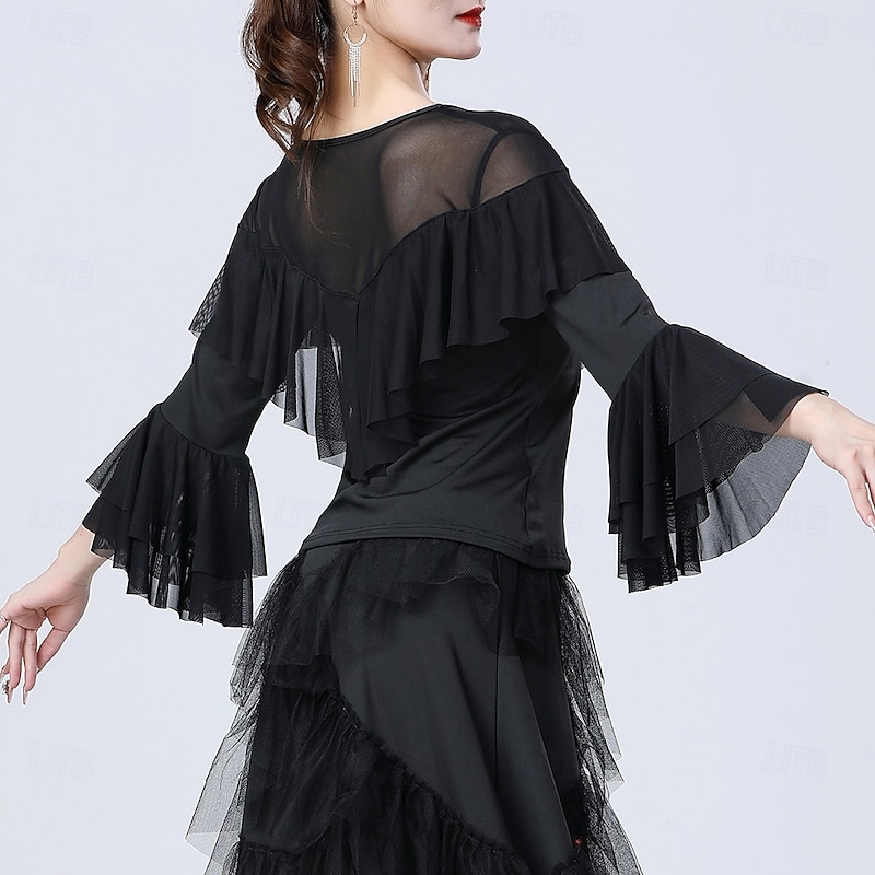 Latin Dance Top Ruffles Pure Color Splicing Women's Performance Training Long Sleeve High Polyester 11