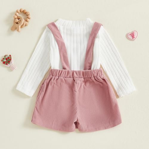 • Cute Design: Baby girl suspender shorts set, kids toddler girl skirt outfits, two-piece suit. Long sleeve mock neck ribbed knit blouse, adjustable button down straps corduroy overalls short, plain color, bow decor, adorable and fashionable