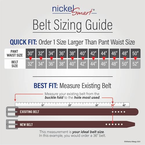 • SIZING TIPS: Measure your current belt from the hole used most to the buckle fold, not including the buckle. This length, in inches, is the size Nickel Smart belt you should order. See the sizing chart graphic for more detail.