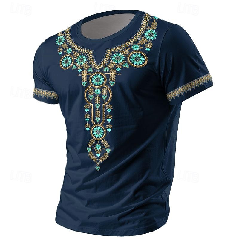 Highlights [Fabric] : Crafted from a high-quality polyester blend, this men's T-shirt offers a breathable and comfortable wear, perfect for spring and summer days. The fabricβs micro-elastic nature ensures a great fit that adapts to your movements with ease. [Fit Type] : Tailored for a refined look, this T-shirt boasts a regular fit that strikes the perfect balance between comfort and style, offering a sleek silhouette that suits various body types. [Design Highlights] : Featuring a striking 3D print with graphic and tribal patterns, this T-shirt includes colorful embroidery in shades of turquoise and gold. The crew neck design and delicately embroidered sleeve edges further enhance its ethnic and artistic appeal. [Occasions] : Ideal for a variety of settings, this versatile T-shirt is perfect for holiday adventures, casual daily wear, and vacation outings. Whether itβs a relaxed day out or a semi-formal gathering, it complements both jeans and slacks with ease. [Size Range] : Available in a broad range of sizes from S to XXXL, this T-shirt ensures a comfortable fit for different preferences and body shapes, catering to a diverse audience looking for contemporary, everyday wear. Perfect for everyday use. superior materials and excellent craftsmanship ensure long-lasting durability.