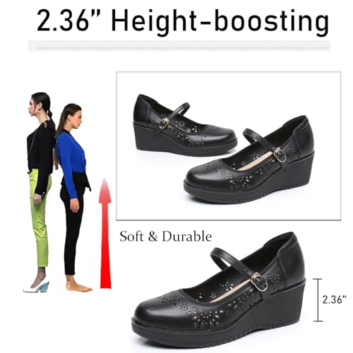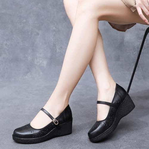 Women's Genuine Leather Mary Janes Wedge Heels Walking Shoes With Adjust Buckle Strap Fashion Breathable Hollow Out Closed Round Toe Platform Sandals Pumps for Party Work Dress Shoes