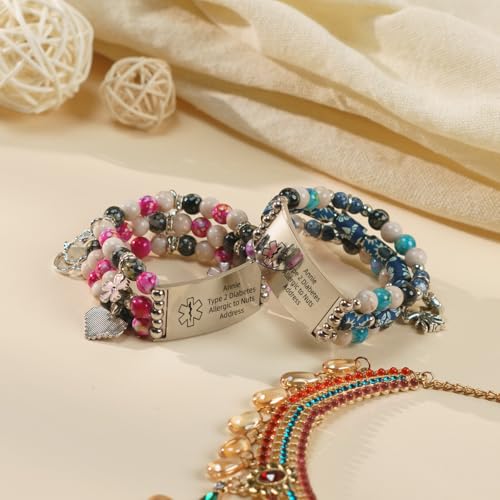 trending ! Personalized Medical Alert Bracelet for Women Custom Natural Stone Beads ID Bracelets Cute Pendant, Handmade Adjustable Elastic Wristband