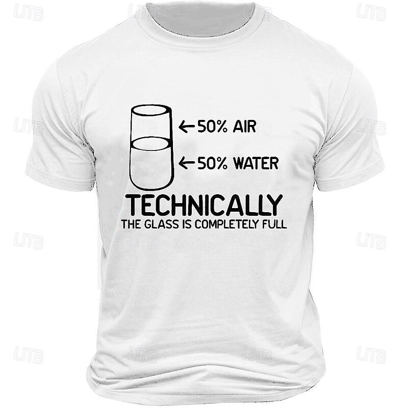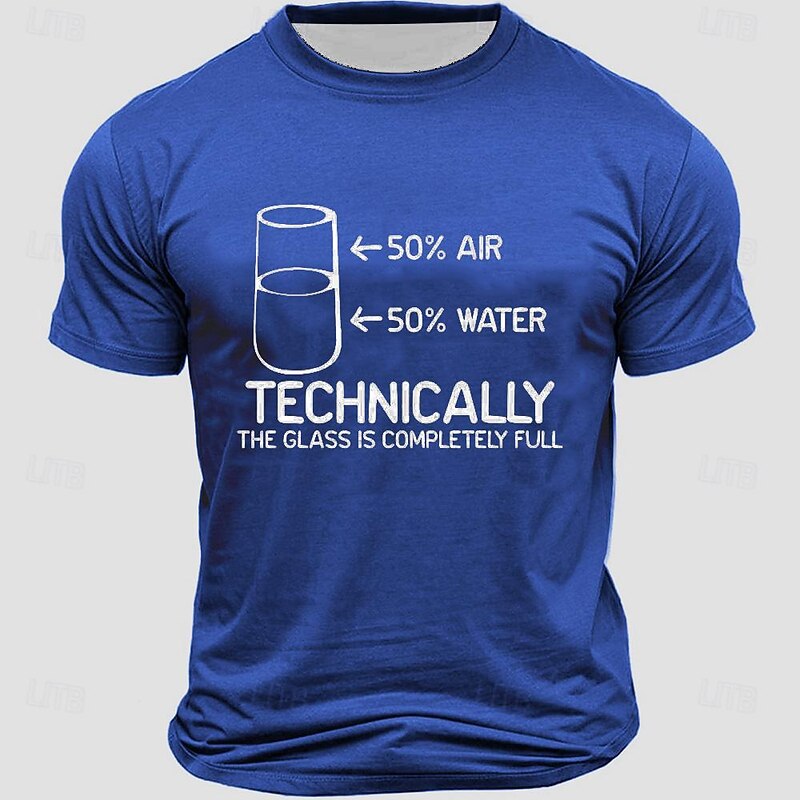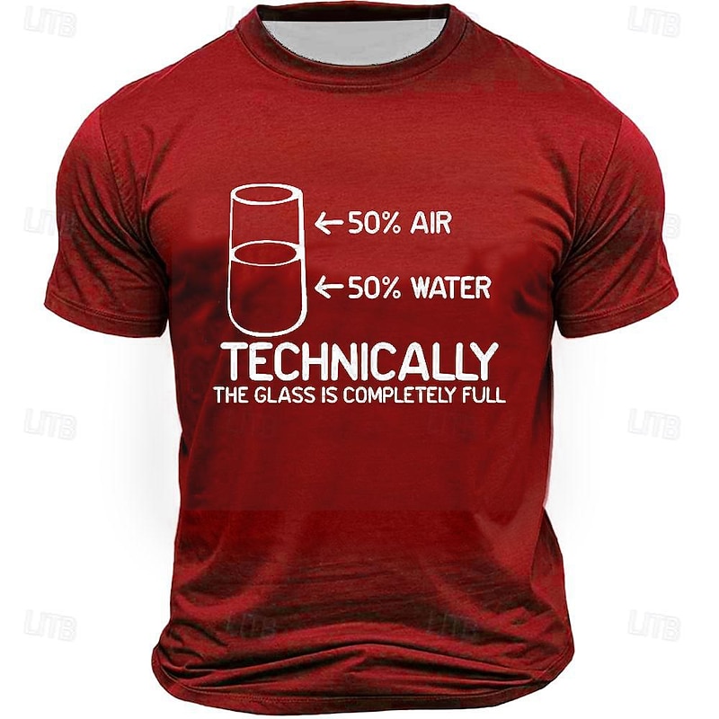 : The centerpiece of this T-shirt is its humorous 3D print graphic featuring a glass illustration labeled "50% Air" and "50% Water," and the witty phrase "TECHNICALLY, THE GLASS IS COMPLETELY FULL." This clever design adds a playful element to the T-shirt, making it a great conversation starter.