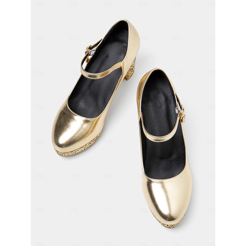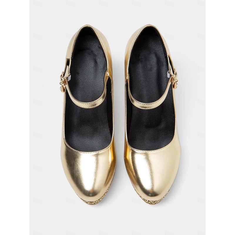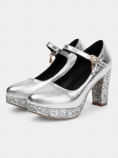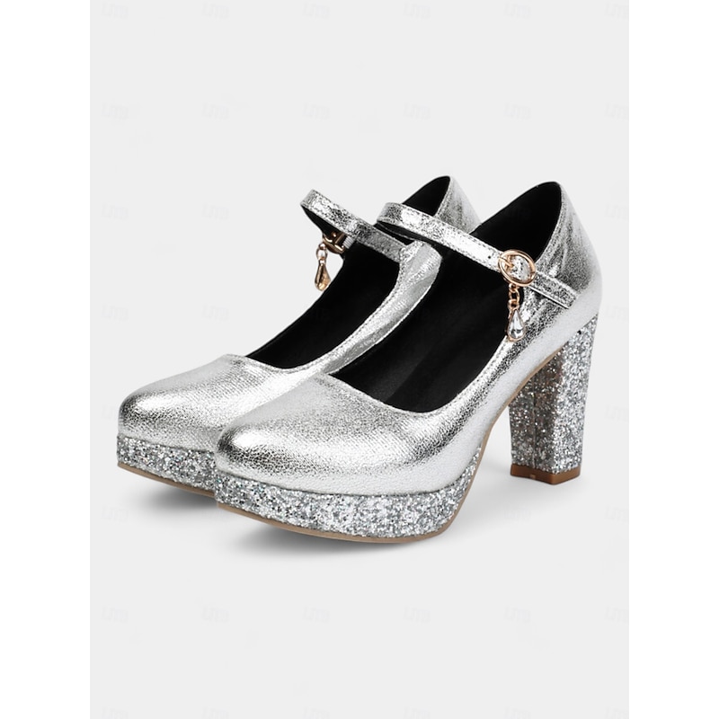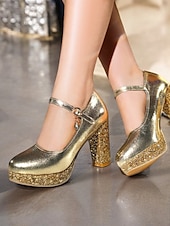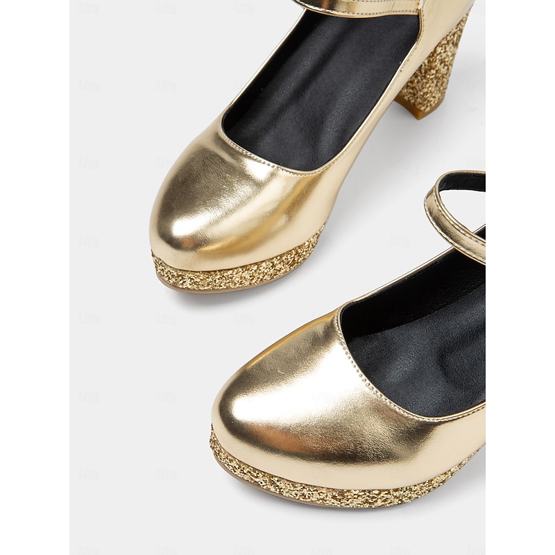 Highlights [Fabric] These stunning Mary Jane pumps are crafted from high-quality PU material for the upper and synthetic leather for the lining. The glossy, metallic finish of the fabric lends a touch of luxury and sophistication to your look, ensuring a standout presence at any event. [Design] The shoes feature a stylish block heel and platform, adorned with glamorous gold glitter for added sparkle and eye-catching appeal. The design includes a chic anklet strap with a decorative pendant, enhancing their fashionable appearance. The round toe shape provides both a modern touch and comfort. [Design Highlights] These elegant pumps boast a lace-up closure that ensures a secure fit and adds an element of style. The chunky heel offers stability and support, making them ideal for extended wear, while the foam rubber outsole enhances comfort for all-day or night use. [Occasions] Perfect for weddings, parties, and formal events, these shoes are designed to complement a range of stylish ensembles. Whether attending a glamorous night out or a sophisticated daytime event, these pumps add elegance to any outfit. [Size Notice] The shoes are available in a range of sizes, from US5.5 / EU35 / UK3.5 to US10.5 / EU42 / UK8.5. It is recommended to select your usual size for a standard fit. With their versatile design and comfortable fit, these pumps are a fantastic addition to any wardrobe.