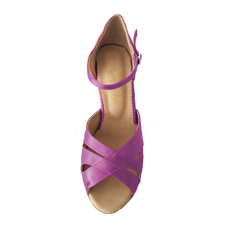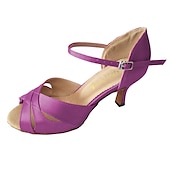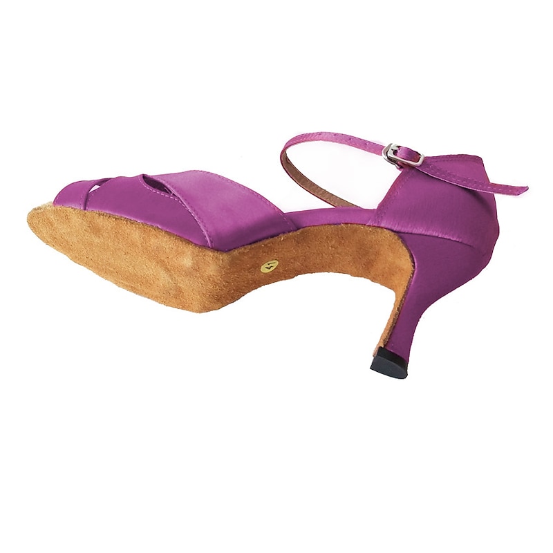 Highlights [Fabric] : Crafted from luxurious satin for a sleek, polished look, these women's dance shoes offer a refined touch suitable for various formal occasions. The smooth satin material combines elegance with durability, making it prefect for frequent wear. [Silhouette] : Featuring a classic open-toe design, these Latin dance shoes boast a timeless flared heel that strikes the perfect balance between style and comfort. The mid-height heel provides stability while ensuring a graceful posture during any dance or event. [Design Highlights] : The shoes are designed with a secure ankle strap with a delicate buckle, adding a touch of sophistication and ensuring a snug fit for dancing. The solid color enhances their versatility, allowing them to be harmoniously paired with dresses or skirts for any occasion. [Occasions] : Ideal for parties, dance events, and formal gatherings, these shoes are the quintessential choice for anyone looking to make a stylish impact. Whether it's a ballroom dance or a festive celebration, they complement a variety of outfits with elegance. [Size Range] : Available in a comprehensive range of sizes from US4-4.5 to US11.5, ensuring a perfect fit for every foot. The size options accommodate various measurements, providing comfort and support for extended wear.