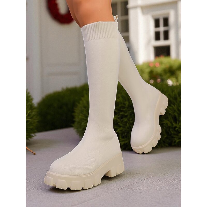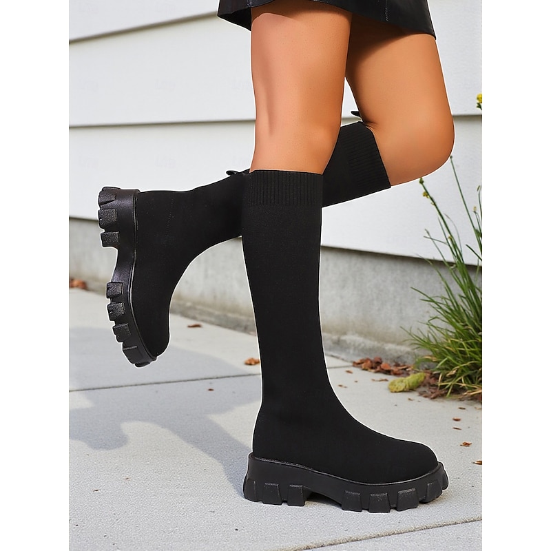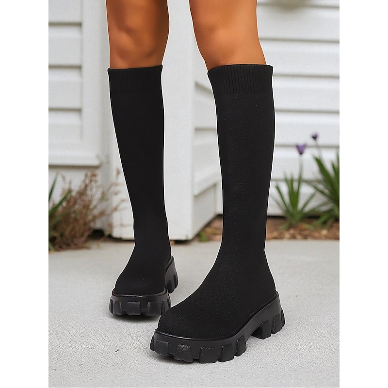 HOT ! Women's Red Flyknit Knee High Platform Boots – Chunky Sole Fashion Sock Boots for Streetwear and Casual Outfits