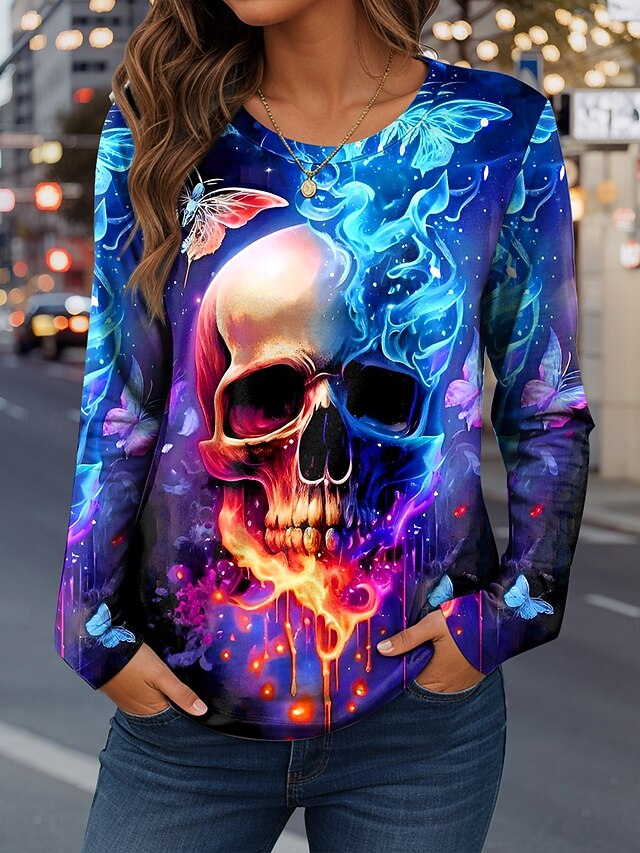 HOT ! Halloween Women's T Shirt Skulls Graphic Fashion Casual Long Sleeve Crew Neck Regular Tops Daily Weekend Print Red Blue Purple Green Spring Fall Winter