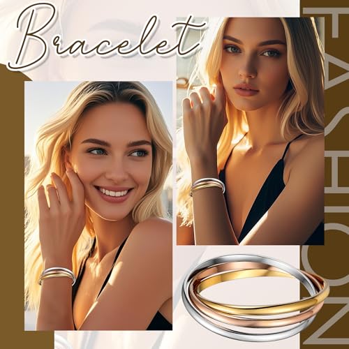 • [Unique Design]: Tri-Colour Stainless Steel Interlocking Bangle Bracelets for women, rose, gold and silver are perfect matched. simple design makes the womens bracelet. This simple yet elegant bracelet lets you sparkle wherever you go.
