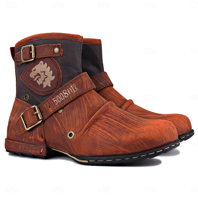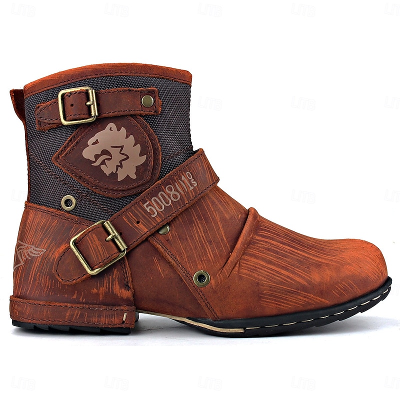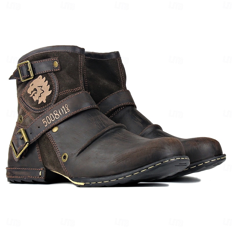 Men's Brown Genuine Leather Ankle Motorcycle Boots with Buckle Straps and Retro Design, Durable Biker Boots for Riding, Outdoor Adventures and Casual Wear 25
