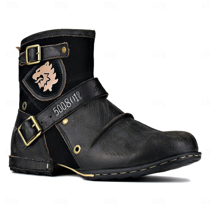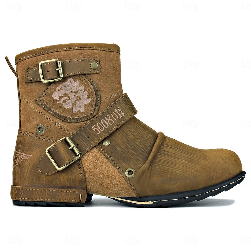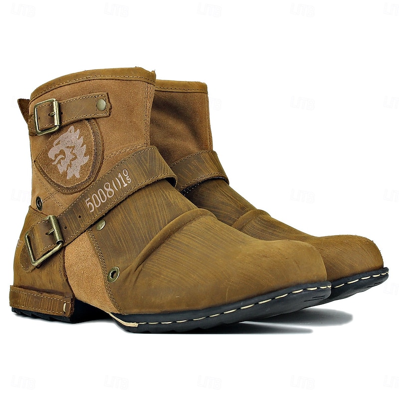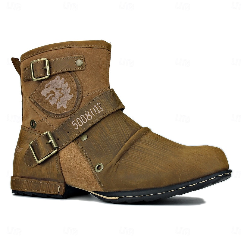 Men's Brown Genuine Leather Ankle Motorcycle Boots with Buckle Straps and Retro Design, Durable Biker Boots for Riding, Outdoor Adventures and Casual Wear 24
