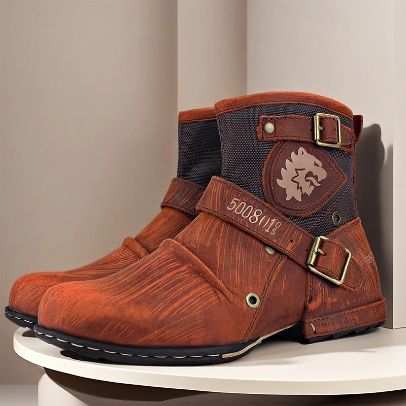 Men's Brown Genuine Leather Ankle Motorcycle Boots with Buckle Straps and Retro Design, Durable Biker Boots for Riding, Outdoor Adventures and Casual Wear 6