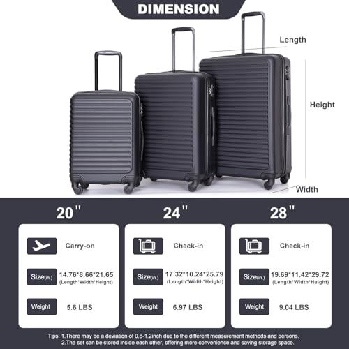 3 Piece Lightweight ABS Luggage Set with Wheels & Lock - Black Travel Suitcase Set (20", 24", 28") 7