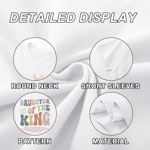 • Design: Eye-catching christian graphic tees with gold-foil "Daughter of the King" letter and crown motif. A girls short sleeve shirt suitable for church, school, or play—ideal religious gifts christian apparel for baptisms or birthdays