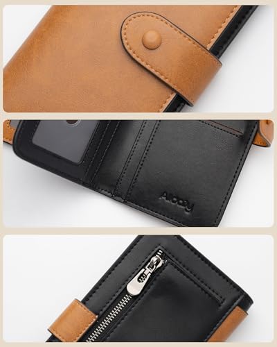 HOT ! RFID Blocking Leather Wallet for Women, Slim Trifold with 14 Card Slots and Zipper Pocket (Brown&Black)