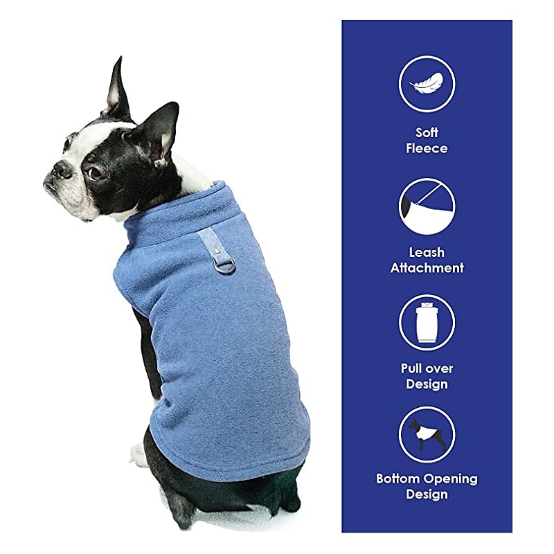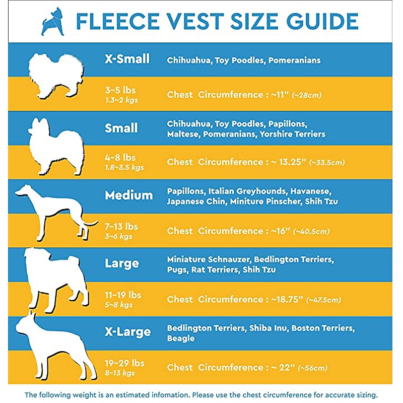 Highlights Keep Your Small Dog Warm All Winter Long - When the cold weather hits, stays warm with the soft and comfortable Made to keep moisture out like freezing rain or snow, and to help keep warm air in, so your dog always stays warm. This small fleece dog vest is safe, durable, and made to last.Pullover Design for Easy On and Easy Off - Imagine this - Outside it’s snowing and freezing and your dog HAS to go. Our Fleece Dog Vest is a pullover that you can quickly and easily put on your dog and head outside - no spending minutes struggling to put it on. It doesn’t require any velcro or zippers to keep secure, so when there’s an emergency, this hassle-free small dog fleece slips on and off with ease.different colors to make sure your small dog is the warmest and coolest fleece dog sweater on the block. It’s designed with armholes big enough for your dog to comfortably walk and go to the bathroom.Machine Washable - During the winter, the cold weather means your dog winter clothes are exposed to salt, snow, and all that gross sidewalk slush. That’s why we made the dog fleece vest machine-washable to remove any dirt easily. No hand-washing or worrying about the dog fleece jacket getting ruined after one walk. Throw it in the washer and dryer, and it’s good to go for your next winter adventure.Accurate Small to Medium Dog Sweater Sizing - We make finding a winter fleece vest that accurately fits your small dog easier than any other winter sweater vest or dog jackets for small dogs. Simply measure your dog's chest size with a tape measure and choose from one of our five easy-fit sizes that suit your dog. We also recommend choosing a neck opening that is bigger than the size of your dog’s head for accurate fitting.