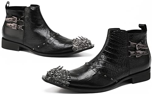 Santimon Men's Chelsea Boots - Genuine Leather Western Ankle Boots with Metal Wingtip-Toe, Zipper & Buckles - Dress & Casual Boots for Party, Disco, Wedding, Prom & Singer