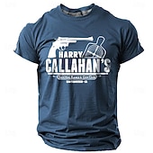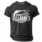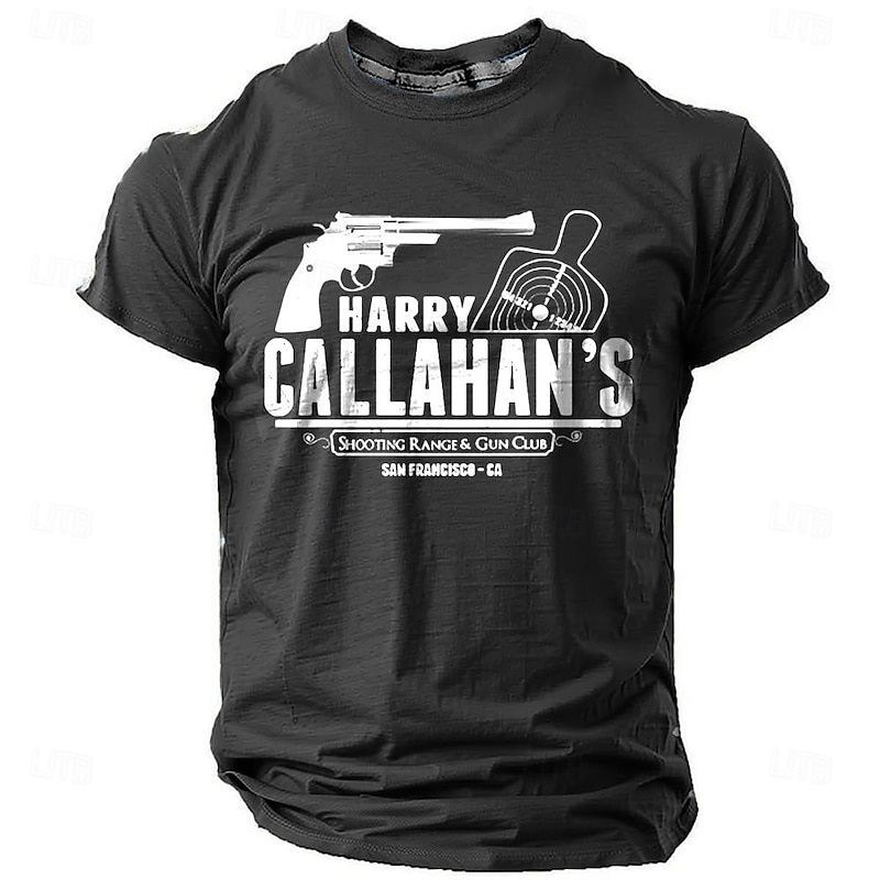 : The T-shirt showcases a bold 3D graphic print on the front, depicting a revolver and target. This graphic includes the text "Harry Callahan's Shooting Range & Gun Club, San Francisco - CA," lending a vintage and edgy appeal. The solid army green color adds a rugged military-inspired element to the shirt.