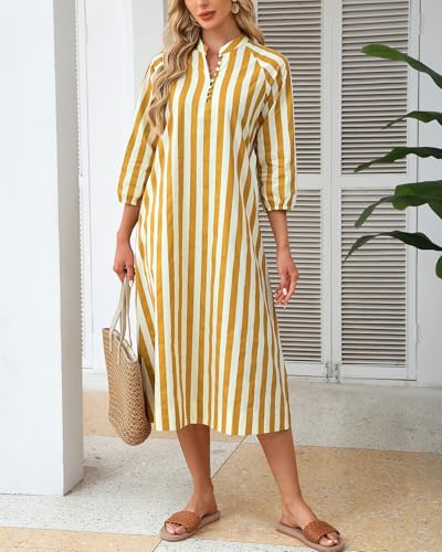Women Summer Striped Button Down Long Maxi Dress Loose Fit 3/4 Sleeve Cotton Caftan Shirt Dress with Pocket 1