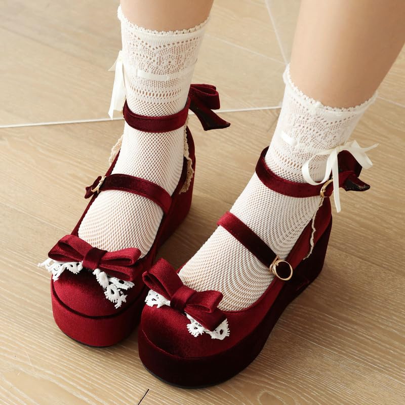 Elbslutt Womens Goth Mary Jane Shoes Platform Kawaii Cosplay Girls Lolita Shoes Round Toe Buckle Strap Chunky Wedge Heel Bow Lace Y2k Ankle Strap Dress Pumps Shoes Oxfords 5