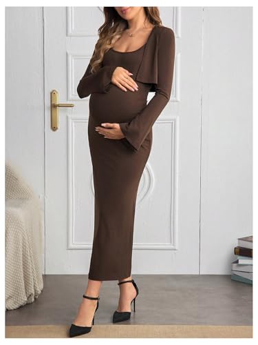 HOT ! OYOANGLE Women's Maternity 2 Piece Outfits Scoop Neck Bodycon Long Cami Dress and Long Sleeve Cropped Cardigan Set