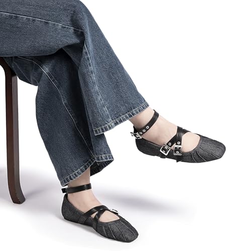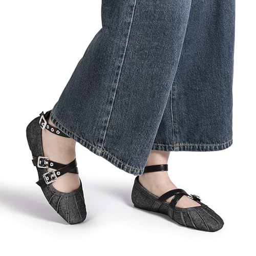 MUSSHOE Denim Mary Jane Shoes: cozy Dress Shoes for Women Cross Strap & Detachable Ankle Strap Design Square Toe Flats for Students Casual Shoes– Embrace Ease & Grace