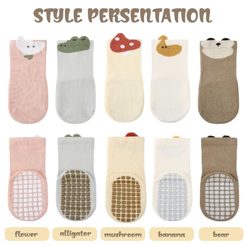 Jspupifip Toddler Non-Slip Socks with Grips for 0-1 Years 5 Pairs Cotton Cute Baby Cartoon Floor Crew Socks Indoor Soft Cotton Frilly Ankle Sock 5