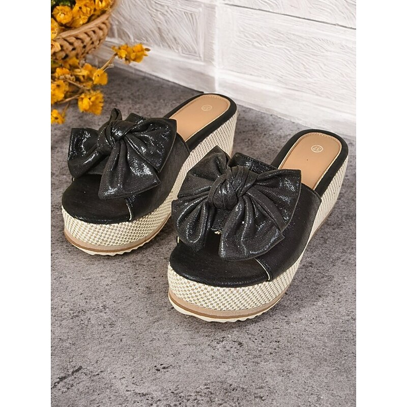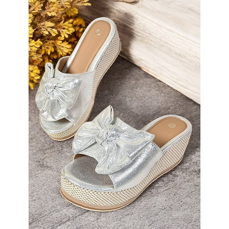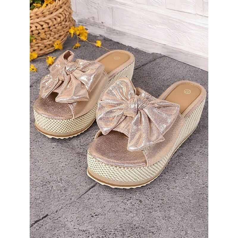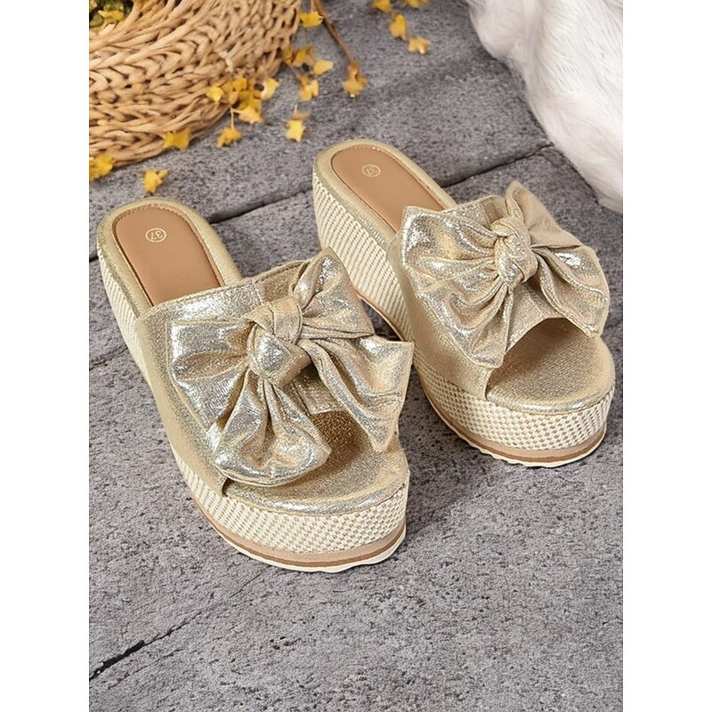 Gold Metallic Bow Wedge Sandals for Women - Glamorous Platform Slip-Ons for Casual Summer Outings 24