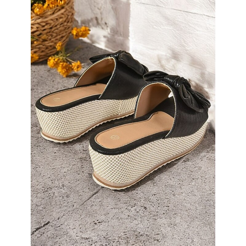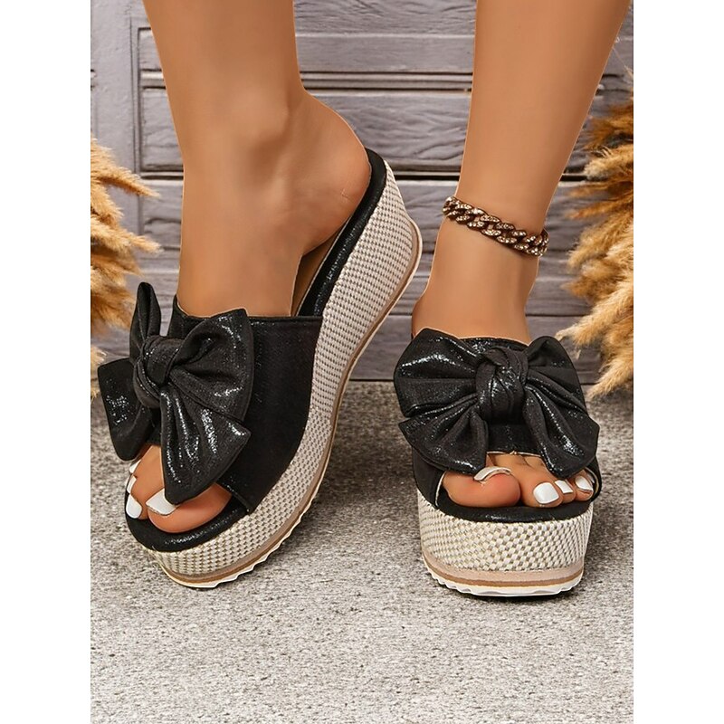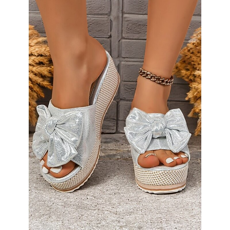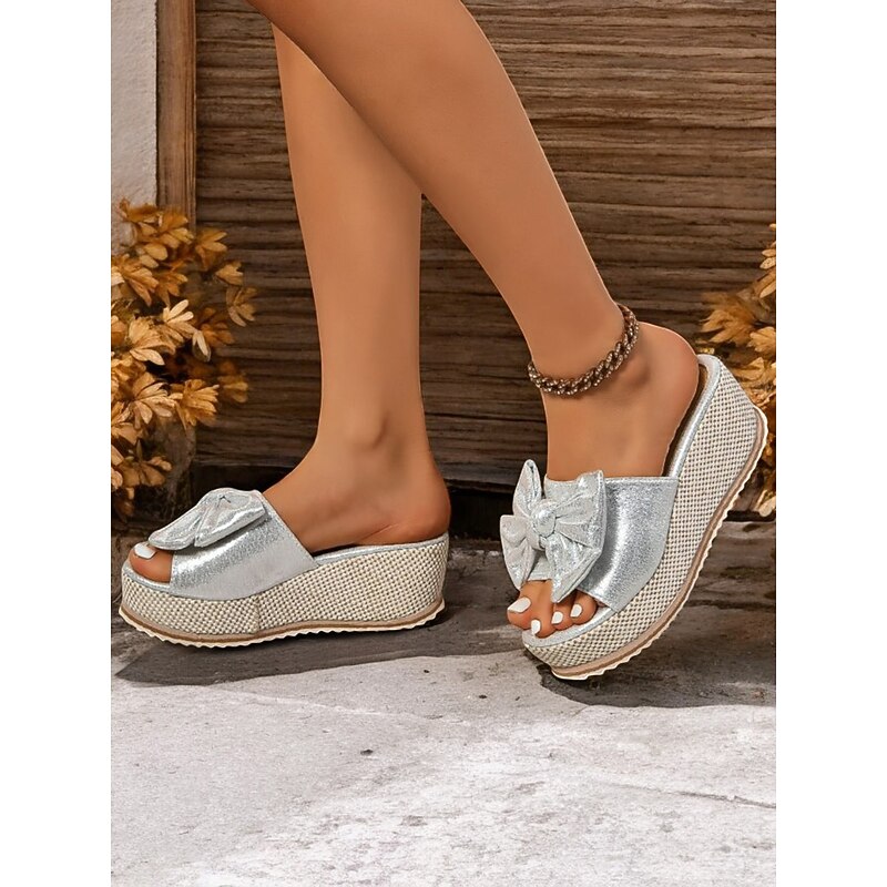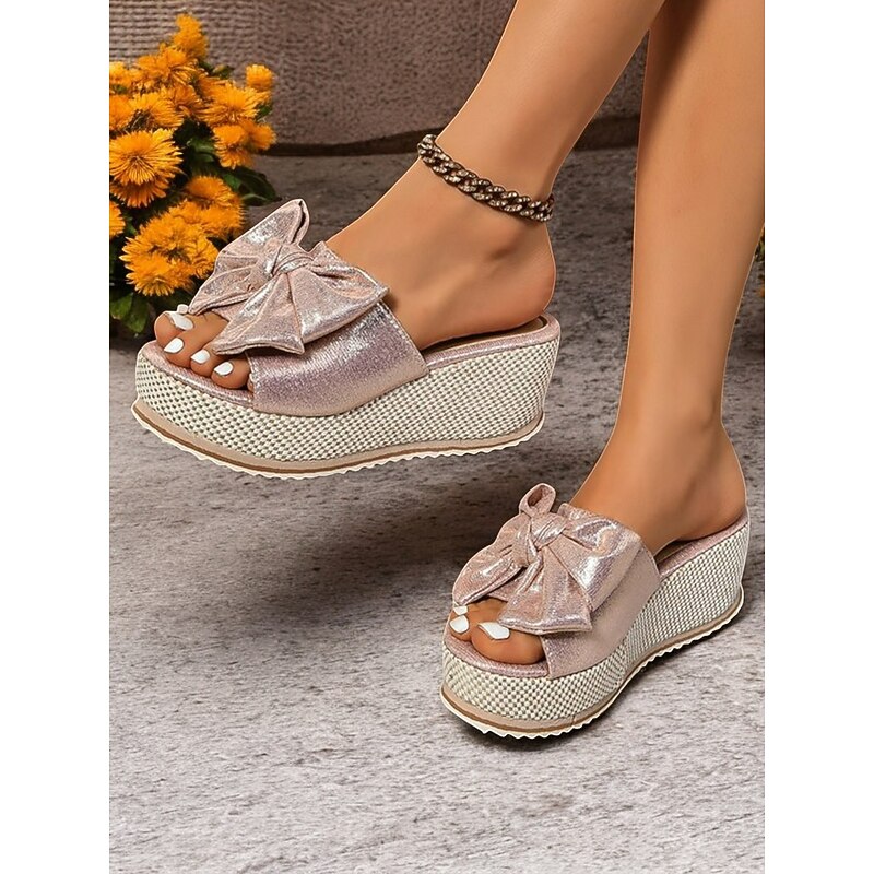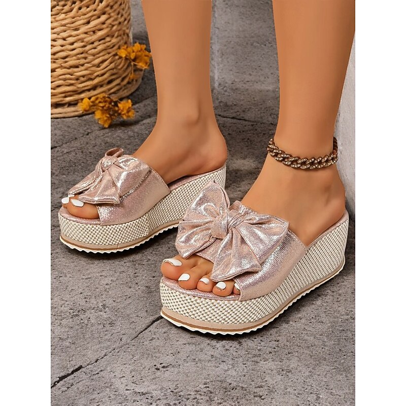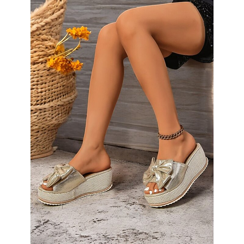 HOT ! Gold Metallic Bow Wedge Sandals for Women - Glamorous Platform Slip-Ons for Casual Summer Outings