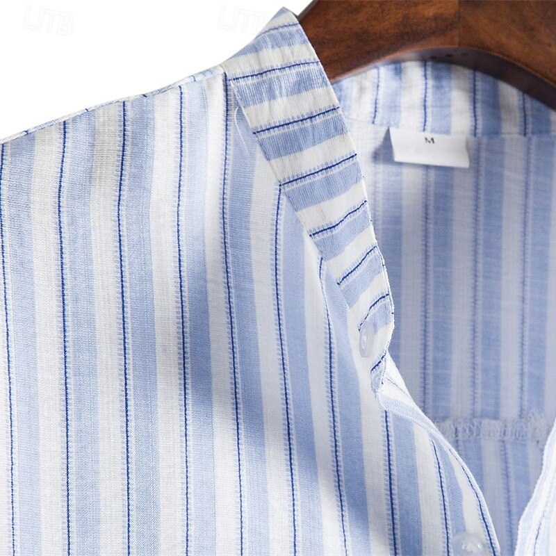 Men's Shirt Summer Shirt Casual Shirt Beach Shirt Button Up Shirt Light Blue Short Sleeve Stripe Grandad Collar Lapel Vacation Hawaiian Clothing Apparel Fashion Casual Comfortable 9