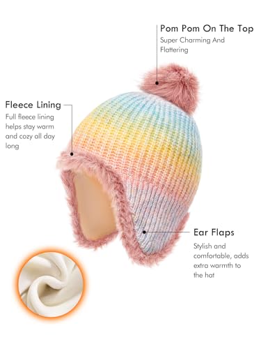 Girls Winter Beanie Hat with Ear Flaps Kids toasty Fleece Lined Pom Pom Knit Hats Snow Ski Cap 4-10 Years