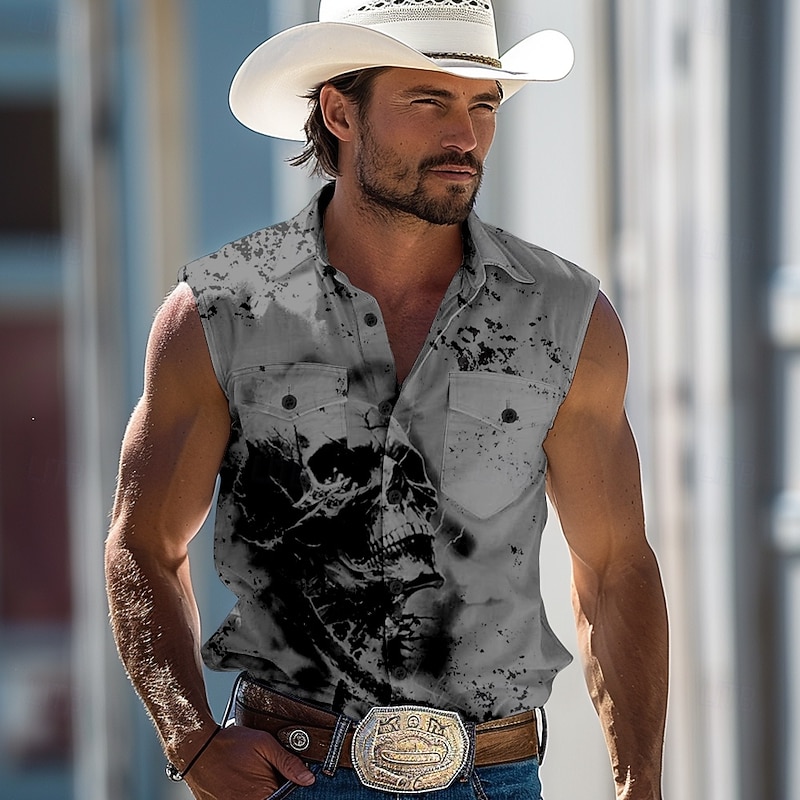 More information about Men's Dark Skulls Shirt Western Shirt Cowboy Shirt Sleeveless Western Style Outdoor Work Causal Summer Spring Turndown 3D Print Button Up Shirts White Blue Green Khaki Gray