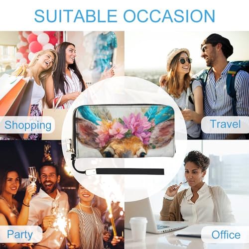 HOT ! Deer with Boho Florals And Feathers PU Leather Clutch Long Bifold Wallet, Coin Purse Credit Pass Case, Durable Card-Holder Money Storage for Women Men