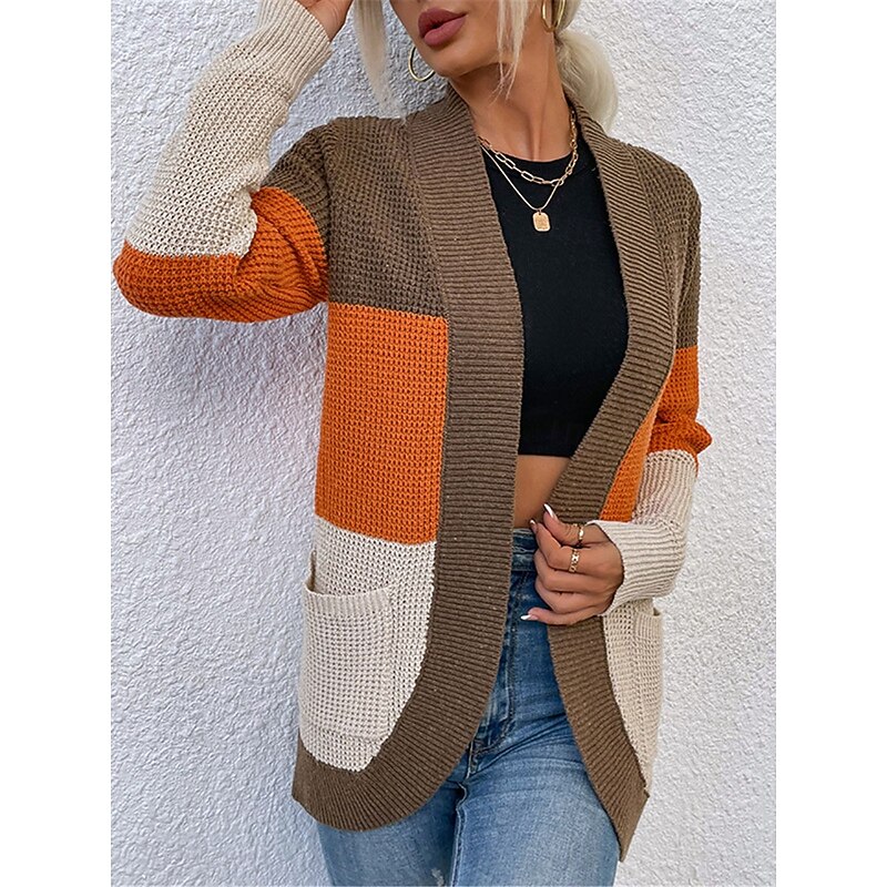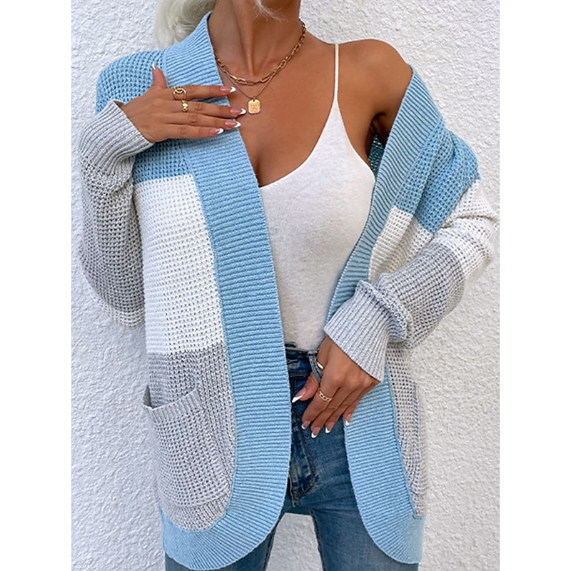 HOT ! Women's Sweater Cardigan Casual Soft Color Block Ribbed Open Front Pocket Knitted Long Sleeve Regular Tops Knit Outdoor Daily Weekend Blue Khaki Fall Winter