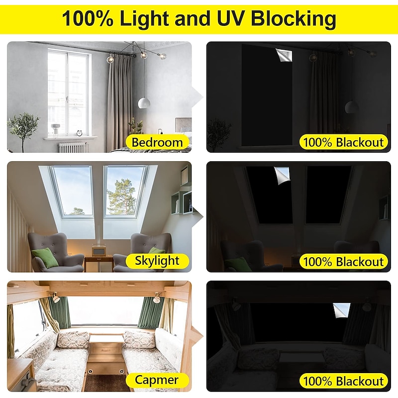 Highlights - Block 100% of Sunlight and UV Rays for a Comfortable Sleeping Environment: Our premium fabric with a special silver coating behind provides complete blackout, reducing heat and creating a real dark and comfortable sleeping environment at any time. - Quick and Easy Installation: Our travel blackout blinds are hassle-free, with just three easy steps - measure, cut, and install. No drilling, no new rods, no residue, and durable for the next use. - Customizable Shape for Any Window: Our temporary blackout window shades can be easily cut to any shape or size needed for camper, doors, patio glass, skylight, small and large windows. Install with double-sided patches on each side to ensure maximum blackout, and cut the door blackout cover oversized to minimize light entering. - Portable and Lightweight: Take it Anywhere: Our portable blackout curtain is light-weight and comes with a handy bag, making it easy to store and take with you anywhere. Ideal for nursery, bedroom, loft, car travel - anywhere you need to block sunlight. - Easy to Clean: No washing needed, simply wipe with a damp towel to remove dust. Our soft and durable blackout window drapes are designed for easy cleaning.