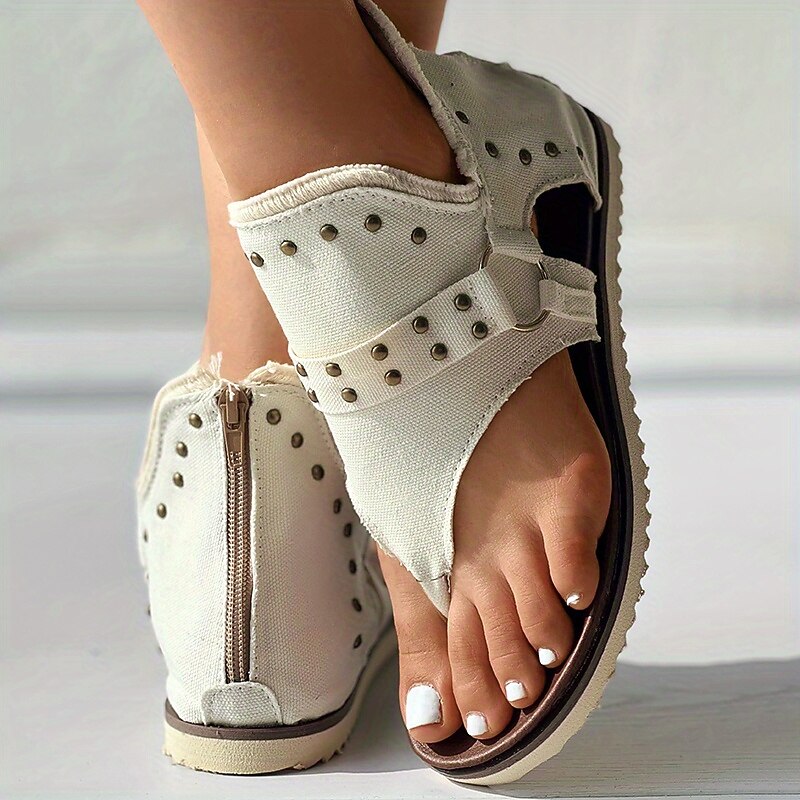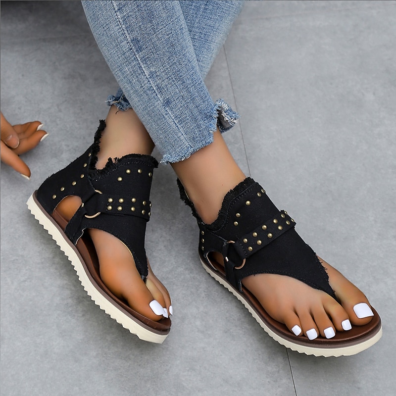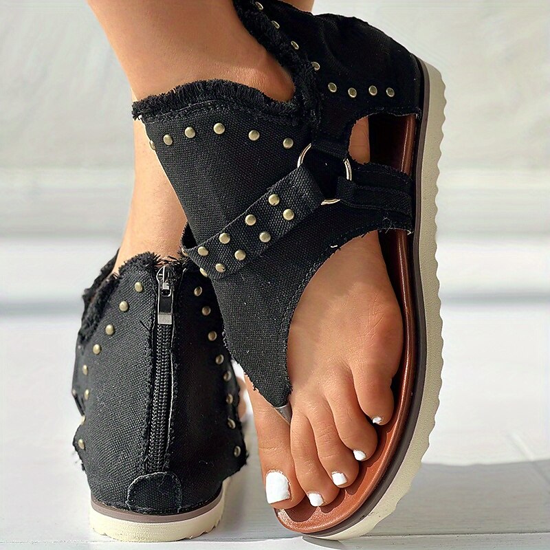 Highlights [Fabric and Material] Crafted from durable canvas, these women's sandals offer a comfortable and breathable fit, perfect for warm weather. The denim fabric with playful star patterns gives a stylish and casual appeal, ideal for various summer activities. [Design and Fit] Featuring a modern flat heel, these sandals are designed with a thong-style open-toe for a comfortable, relaxed fit. The ankle area is secured with a convenient back zipper, allowing easy wear and removal. [Distinctive Design Elements] The sandals are adorned with decorative metal studs along the edges, adding a touch of edginess and flair. Frayed edges contribute to a relaxed, bohemian vibe, making these sandals a standout accessory for summer. [Occasions and Versatility] Ideal for daily outings, beach trips, or casual gatherings, these sandals are versatile enough for various occasions. Their minimalist style makes them easy to pair with a range of outfits, ensuring you look stylish while staying comfortable. [Available Sizes] These sandals are available in a range of sizes from US5.5 (EU35) to US10.5 (EU42), ensuring a suitable fit for different preferences. Style options include black, blue, and beige, catering to your personal taste.