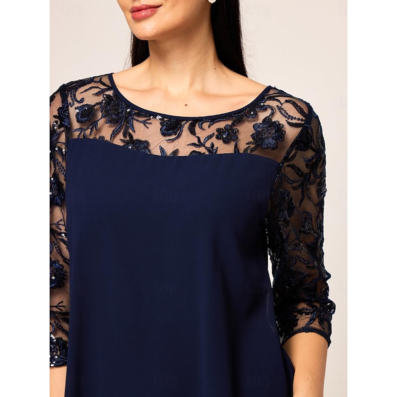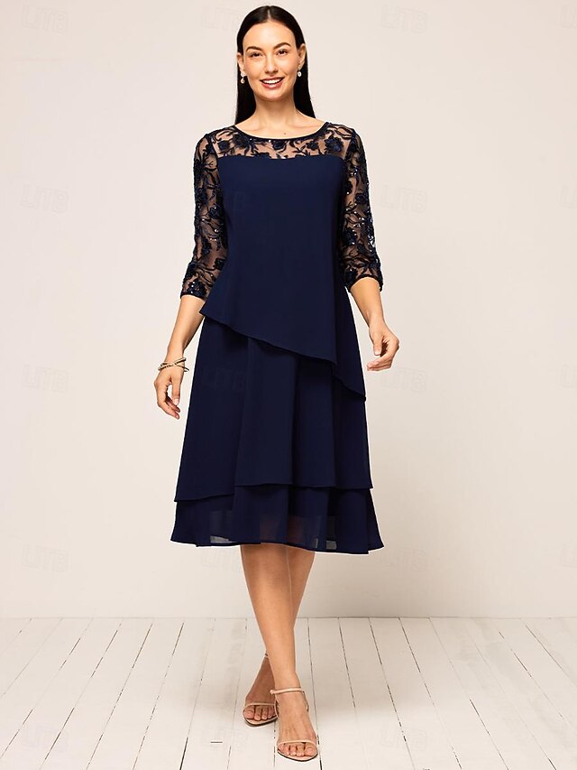 Women'sWedding Guest Cocktail Dress Chiffon Ruffle Party Elegant Formal Crew Neck Flared Sleeve Dark Blue Color 1