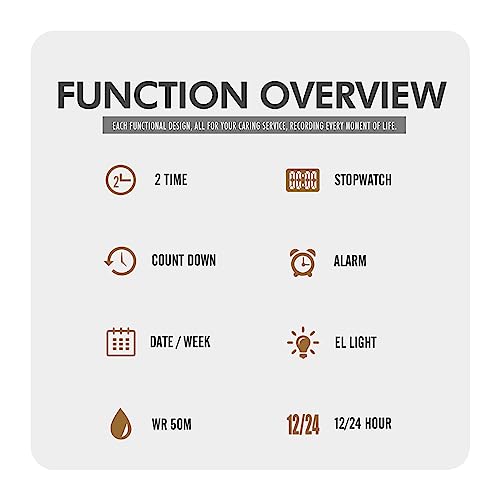• 12/24 hours switch,Calendar with months, days, and weeks, stopwatch , Alarm, Dual Time, EL Backlight, Countdown. Dark or low light environment,No Problem. Suitable for men, women, the Elderly.