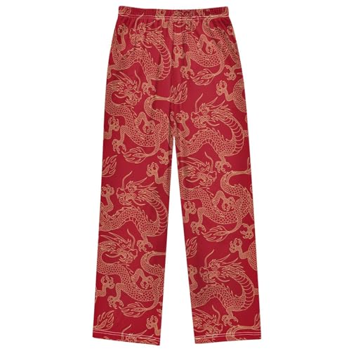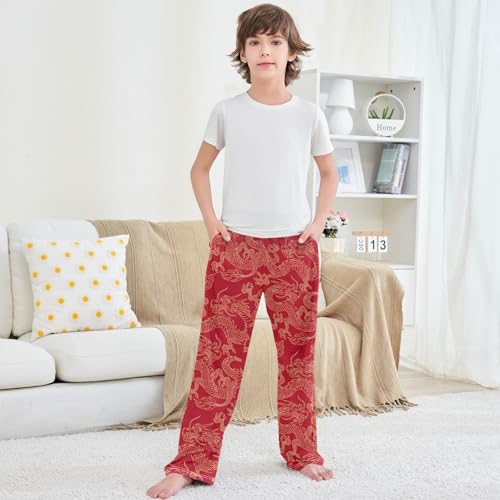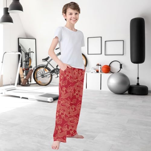 Boy's Pants Gold Chinese Dragon Red Jogger Pants Elastic Waist Long Bottoms Trousers with Pockets 6-14 Years 6
