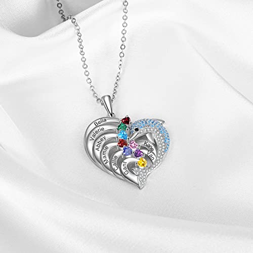 HOT ! Nobelook Personalized Love Heart Dolphin Pendant Necklace Engraved 1-4 Name with Simulated Birthstones Jewelry Gifts for Mothers Wife Girlfriend BFF Valentine's Day (8 birthstones+8 Names)