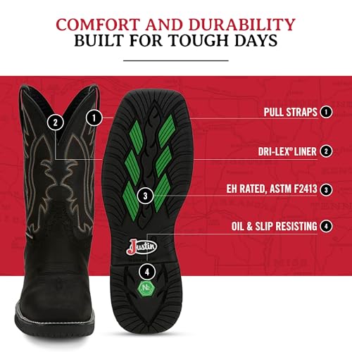 HOT ! Justin NiTread 11” Composite Toe Boots for Men - Commander Collection - Square Toe Full-Grain Leather Men’s Work Boots with Comfort Footbed and Oil & Slip-Resistant Outsole