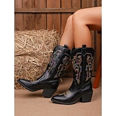 More information about Women's Black Faux Leather Western Cowboy Boots – Embroidered Mid-Calf Boots with Block Heel, Rodeo Festival and Country Party Footwear