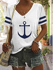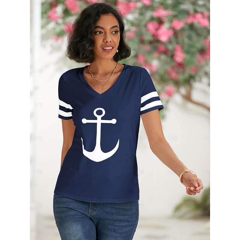 HOT ! Women's T Shirt Burgundy Tee Basic Anchor Print Short Sleeve Regular Tops V Neck Daily Weekend White Blue