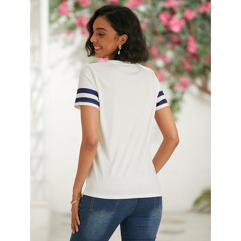 Highlights [Fabric] : Made from a high-quality polyester blend, this women's t-shirt offers a soft and breathable experience, ensuring comfort throughout the day. Its lightweight and durable fabric is perfect for everyday wear. [Fit] : Designed with a regular fit and a classic V-neckline, this t-shirt provides a flattering silhouette that effortlessly complements a variety of body types. The short sleeves feature sporty navy stripes, adding a touch of casual elegance to the overall look. [Design Highlights] : The standout feature of this t-shirt is its nautical theme, showcased by a bold navy anchor graphic on the front. The print is achieved through hot stamping, ensuring vibrant and lasting colors. This piece combines modern maritime flair with basic style elements, making it a versatile wardrobe staple. [Occasions] : Ideal for daily wear or weekend outings, this t-shirt effortlessly transitions from casual to chic. Whether paired with jeans for a relaxed look or dressed up for a casual gathering, this t-shirt adds a maritime charm to any occasion. [Size Range] : Available in a range of sizes from S to 2XL, catering to a variety of body shapes and preferences.
