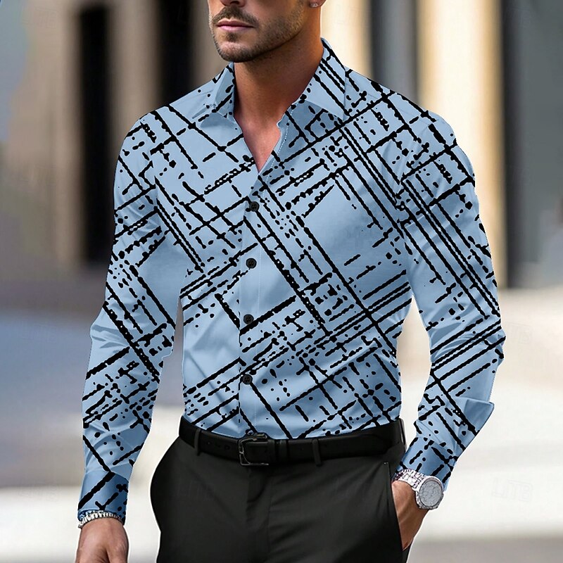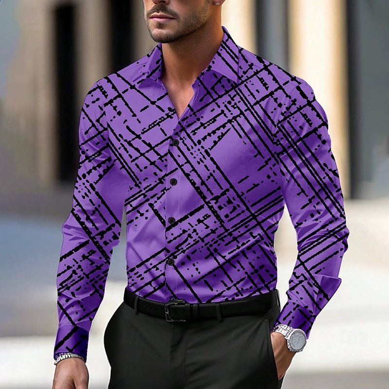 Highlights [Fabric] : Crafted from a high-quality polyester blend, this men's shirt offers a comfortable and lightweight experience, ensuring durability and ease of care. The fabric's elasticity provides a perfect balance between flexibility and structure, making it suitable for long wear. [Fit] : Designed as a regular fit, this shirt provides a balance between slim and relaxed, offering a well-tailored look that complements a variety of body types. Its long sleeves and structured form make it an ideal choice for business and smart-casual occasions. [Design Highlights] : Featuring a bold geometric pattern with a striking 3D print, this shirt stands out with its modern and abstract design. The classic shirt collar and button-up front enhance its timeless appeal, while the intricate pattern adds a contemporary touch. Available in a range of colors, including blue, white, black, and purple, it adds versatility to any wardrobe. [Occasions] : Perfect for daily business wear and smart-casual settings, this versatile shirt can be easily styled for various occasions. Whether you're attending a meeting, going out for a casual day, or enjoying an evening event, its modern elegance makes it a suitable choice across seasons, including fall, spring, and summer. [Sizes] : Available in a wide range of sizes from S to 3XL, this shirt accommodates different body types and preferences, making it accessible to a broader audience.
