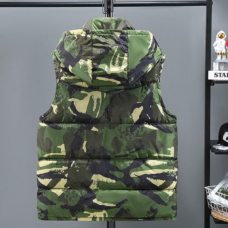 Men's Puffer Vest Vest Gilet Vacation Daily Date Fashion Casual Winter Pocket Polyester Warm Comfortable Camouflage Zipper Hooded Regular Fit Black Green Light Grey Vest 6