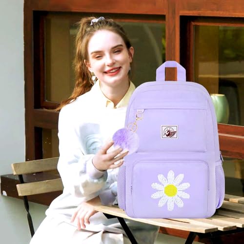 KLFVB Bookbag for Girls, 17.5" Cute Seuqins Aesthetic Backpack, Water Resistant College School Bag for Women Teens Middle Primary Students - Flower Purple