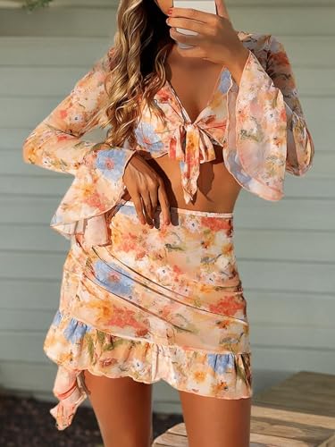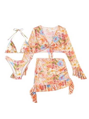 • Features: Floral print, halter neck, ruffle hem, ruched, thong bottom, triangle, 4 piece bikini sets for women